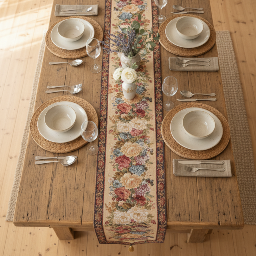 Decorate your table with our beautiful Morning Awakening Table Runner. Colorful woven flowers feature heavily on this runner. Bright and colorful this charming table runner liven up your next dinner party with this charming table runner.